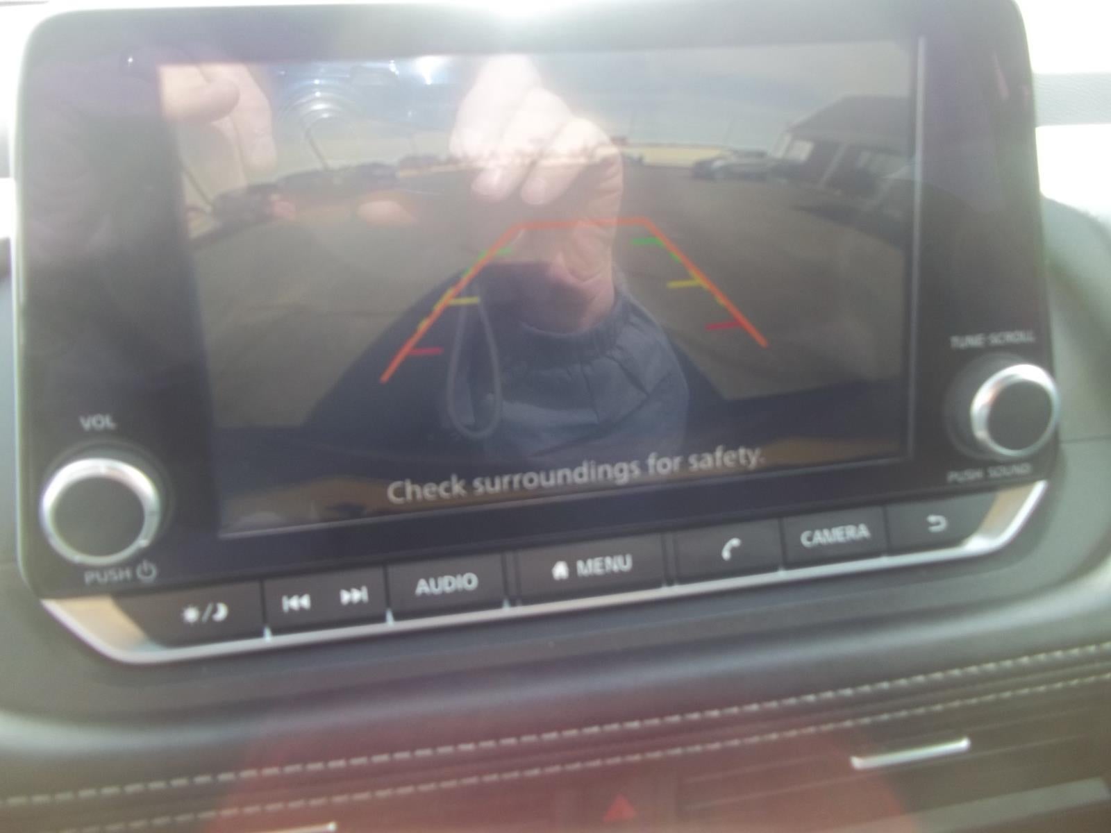 - The vehicle is equipped with a camera that displays an image of the area behind the vehicle on an interior display.